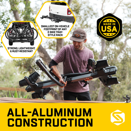 - Compact Design – smallest on-vehicle footprint of any 2-bike tray-style rack.